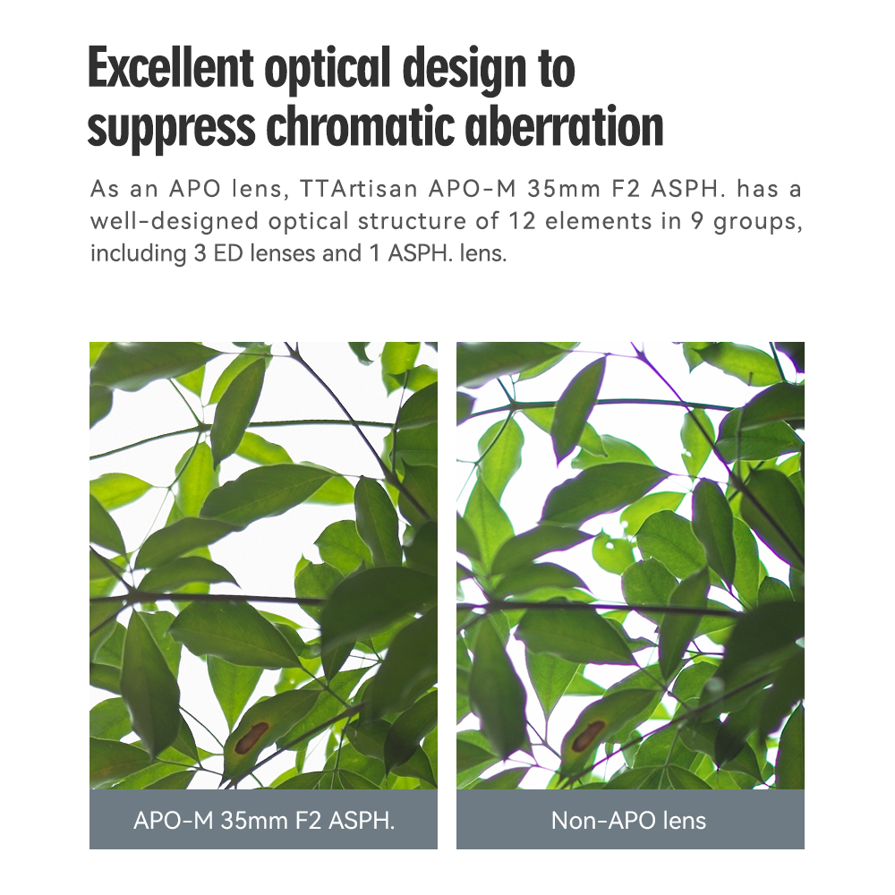 As an APO lens, TTArtisan APO-M 35mm F2 ASPH. has a well-designed optical structure of 12 elements in 9 groups, including 3 ED lenses and 1 ASPH. lens.