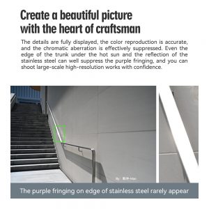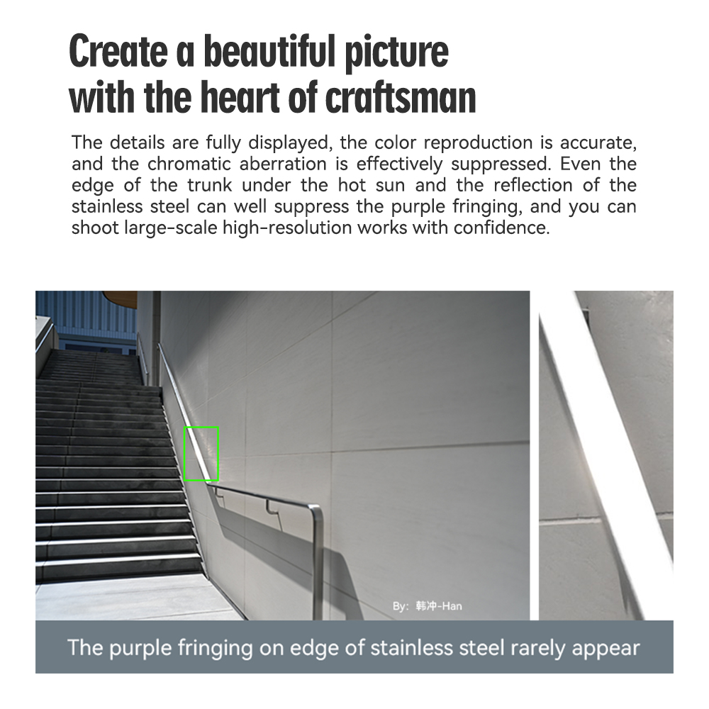 The color reproduction is accurate. The detailed performance and the chromatic aberration control are great. Even under the scorching sun , the purple fringing on edge of the tree trunk and stainless steel rarely appear. You can shoot high-resolution works without worries.