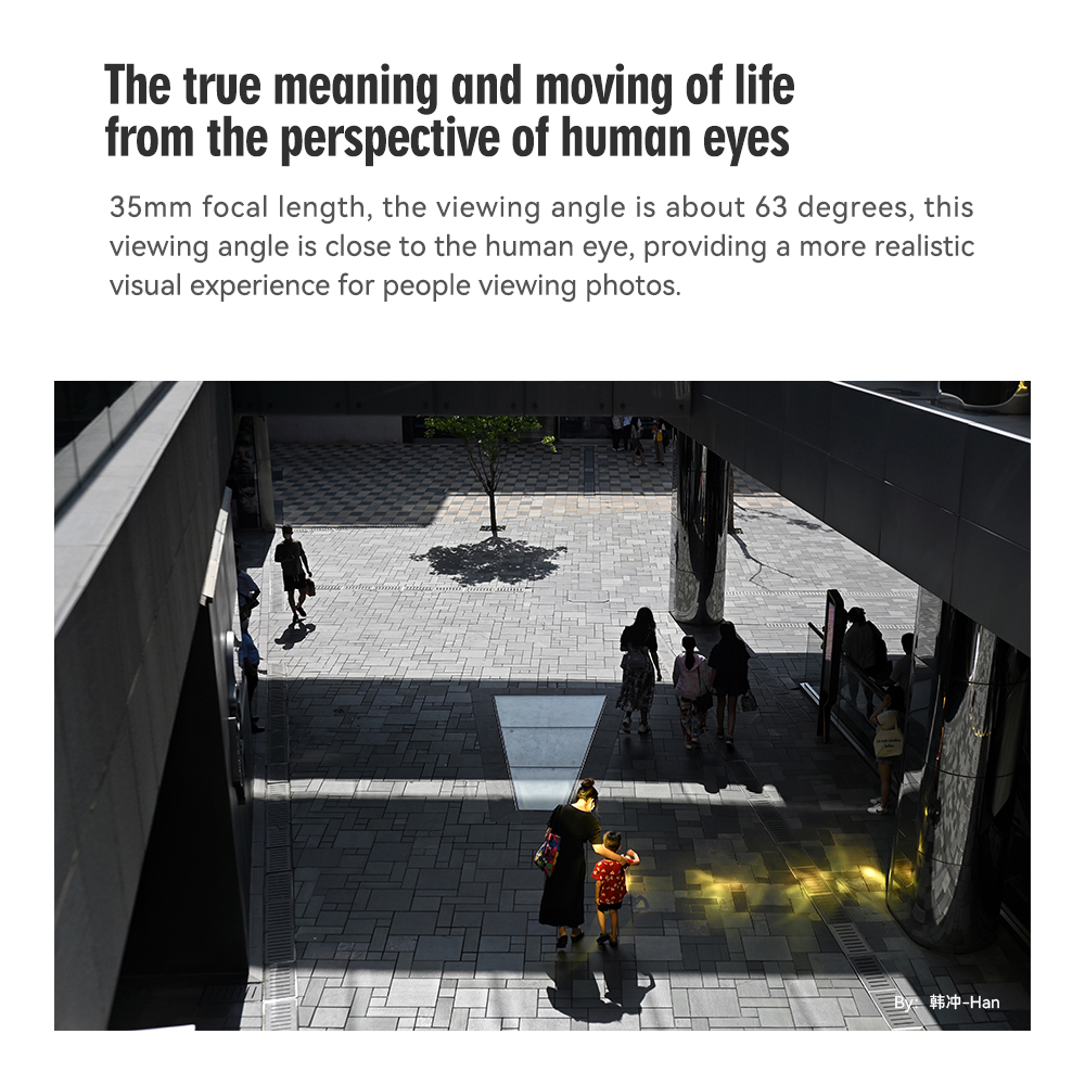 35mm focal length, the viewing angle is about 63 degrees, this viewing angle is close to the human eye, providing a more realistic visual experience for people viewing photos. From the moment the 35mm lens is installed, whether it is to record the fleeting moments on the street or to record the bits and pieces of your own life, the 35mm real perspective can well present the true meaning and moving of life.